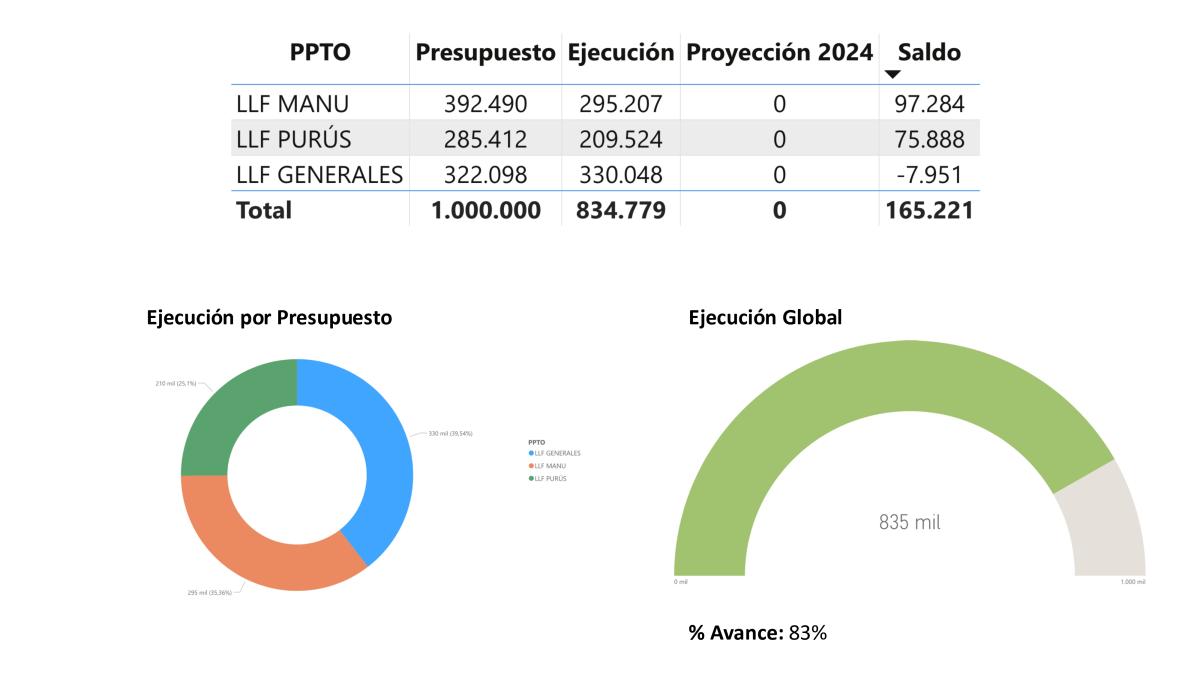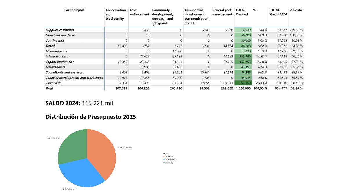 El presupuesto global se dividió en tres presupuestos: LLF Manu, con USD 392,490 destinados a las acciones en el Parque Nacional del Manu y su zona de amortiguamiento; LLF Purús, con USD 285,412 asignados a las actividades en el Parque Nacional Alto Purús y su zona de amortiguamiento e influencia; y LLF Generales, con USD 322,098 dirigidos a gastos comunes y acciones transversales para ambos paisajes.